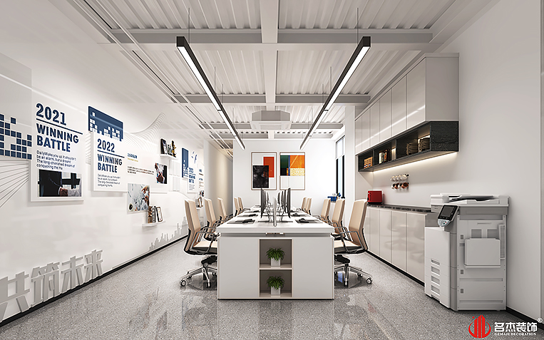展廳區域利用原有空間的結構,根據原有空間的結構,量身打造了很多展柜,結合對燈光的運用,為產品展示提供了更多的便利。同時設計團隊運用時尚且簡約的風格,為整體辦公裝修設計空間定下一個很好的基調。#工裝裝修#