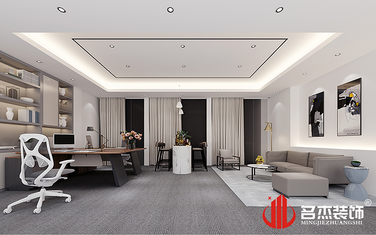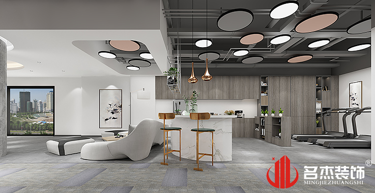 整體空間以白灰色調為主基調,也在前臺區域增加綠植元素,來體現給產品的綠色環保,同時也在燈具方面使用圓弧形的吸頂燈,增加整體空間的設計感,同時綠植元素的加入,也使得綠色環保的意識加入到空間當中。