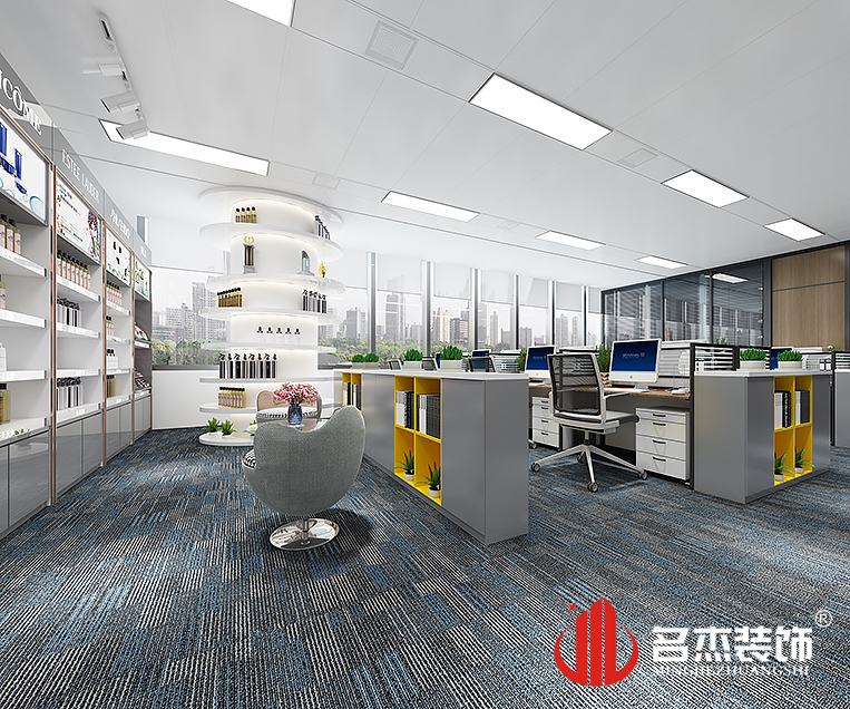 考慮到化妝品以女性為主,現代女性審美以小清新自然風居多。整體以薄荷綠和原木色相互交替,視覺感清新優雅,更能留住女性的心。辦公室區域裝修又較為不同,明顯分別出各個區域,員工的舒適就是工作動力業績上升的踏板。