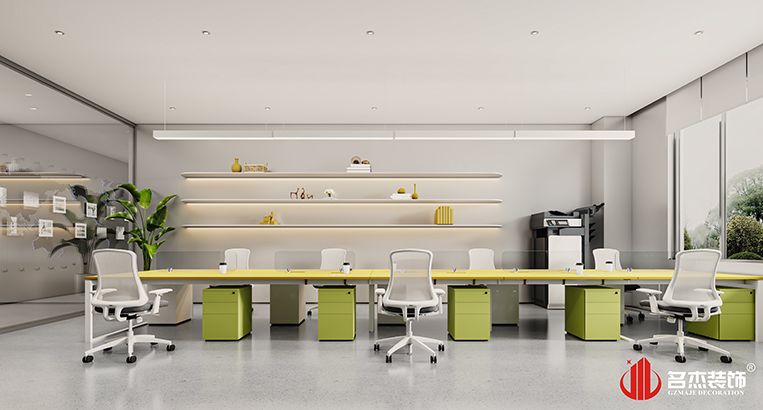 這次的主打風格是時尚簡約風格,同時配合不同色塊的運用,讓空間展示的風格不再單調,也讓空間變得更有趣。不同色彩的加入不同區域,讓其功能區域得到明顯的區分,工作效率也能夠得到提升。品牌色的加入,能夠更好的讓員工理解企業文化,也為空間增添不少的企業文化氛圍。#廣州辦公室裝修設計#